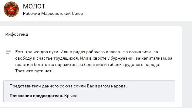 Итак. Старая линия пропаганды группы «Молот» никуда не годится. В этом мы с В. Яневой абсолютно согласны. В её группе вечно публикуется какая-то уже до слёз очевиднейшая банальщина, не имеющая отношения к злободневным вопросам: к вопросам текущей классовой борьбы и реакции капиталистов в виде «коронавирусного» террора и «коронавирусной» пропаганды и агитации. Мало того, редакция «Молота» ещё и активно пособничает буржуазной власти в деле «коронавирусной» пропаганды и агитации — предлагает своим глупым читателям поверить на слово в «существование ковид-19» и в «смертельную угрозу», которая с ним якобы связана. Доказательств же «страшной эпидемии» администрация «Молота» своим читателям никаких не предлагает. Мол, «это общепризнано», ну а тем, кто им не верит — пожизненный бан с комментарием «Крыса».